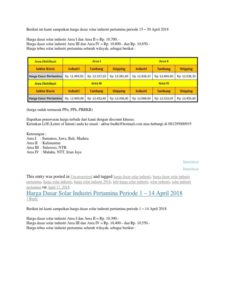Informasi harga ini untuk area distribusi solar industri pt pertamina persero tbk area i meliputi sumatera jawa bali madura.